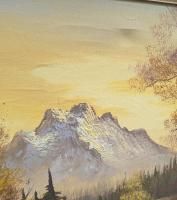 こちらは黄金色の空に映える雪山とその空を映し出す川面と紅葉が美しい晩秋の風景油絵額。